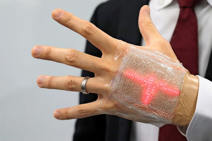 実験でディスプレーを医療用の接着剤で手に貼り付けた。心電図の波形や数字などの簡単な動画を映し出せた。