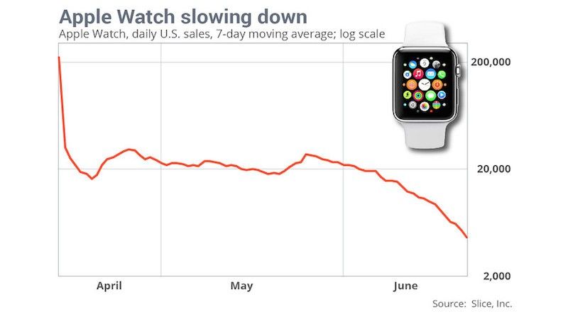 上のグラフを見ると、Apple Watchはリリース後の4月や5月は1日たり2万本を安定して売り上げていました。しかし、6月になると大きく下落。