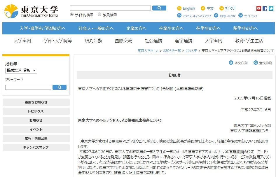 その後の調べで、不正なアクセスは、管理部門の職員のパソコンに会議に関するメールが届き、添付されたファイルを開くと感染するという仕掛けで行われていたことが分かり、東京大学は、流出した可能性のあるすべてのパスワードを変更するなどの対策を取りました。