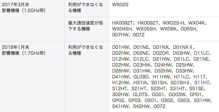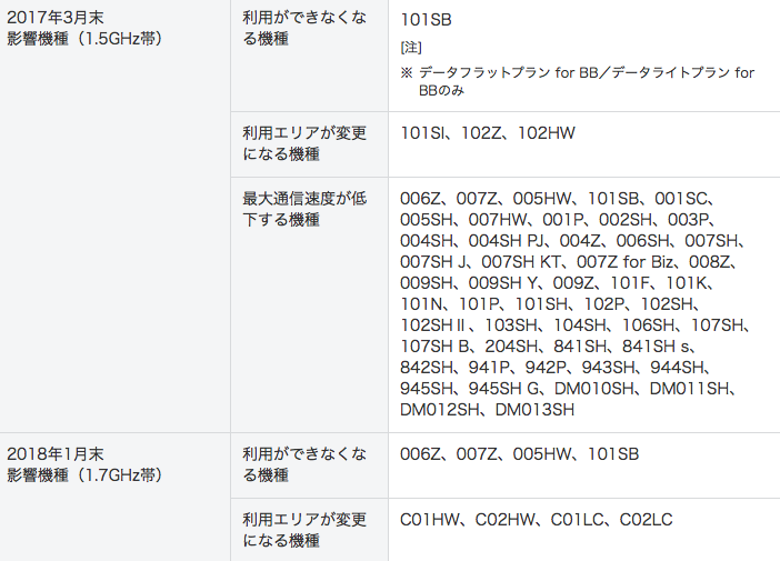 なお、3Gサービスの一部終了にともなって、ソフトバンクおよびY!Mobileの一部機種において、利用できなくなったり