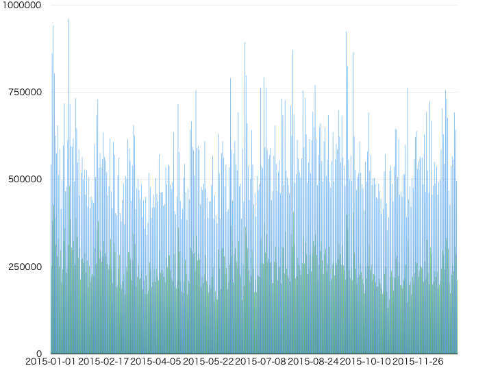 日別データはこんな感じ。こちらはLivedoorから取得したデータで、青がPV,緑がUUです。