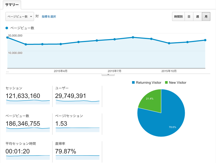 で、2015年は合計でちょうど2億PVでした。2014年が1億4千万ほどだったので、約1.4倍ほどの伸び。しかし、上位の2chまとめサイトは月間1億PVですので、約6倍の差。格が違うなぁ〜と打ちのめされております。