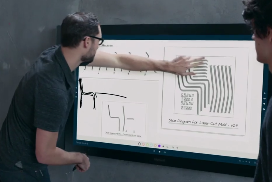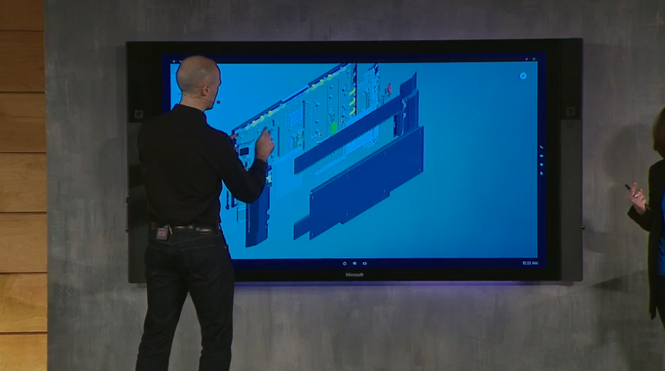 指で感覚的にオブジェクトをグリグリ動かしたり……Surface Hubはディスプレイの横に2つのインカメラを内蔵、マイクロフォン・高度なセンサーも搭載しているので、Skypeを使って複数人とビデオ会議をすることも可能。