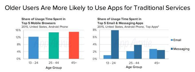 メッセージングアプリが、モバイルファースト時代のコミュニケーションの未来であることへのわずかな疑問を打ち消すかのように、今日発表された調査結果がその勢いを示す明確な数字を示している ― そして若者ユーザーの間でのEメールに対する優位性を。App Annieのレポートによると、Eメールはこの集団の中では事実上死につつある。13~24歳がメッセージングアプリの利用に費やす時間は、45歳の3.5倍以上であり、年長ユーザーたちは、依然としてEメールやウェブブラウザーといった、デスクトップを再現するアプリを主に使っている。