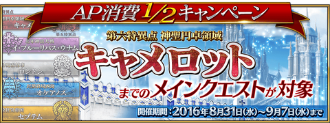 キャメロットまでのメインクエストAP消費1/2キャンペーンを開催いたします。