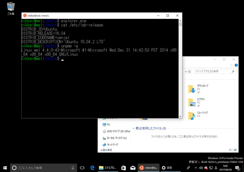 Windows内で動くLinux。一見、Windowsのコマンドプロンプトと同じだが、PCで動くUbuntu Linuxが改変なしに動作する。Windowsのアプリケーションを呼び出しで起動することも可能だ。